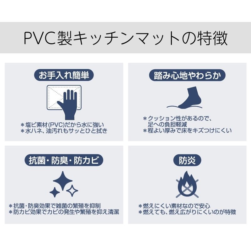 抗菌、除臭、抗真菌、防火。由 PVC製成的廚房墊,可以用水輕鬆擦掉污垢。適中的厚度和出色的緩衝性,即使長時間站住,雙腳也不會感到疲倦。即使掉落物件,也能吸收衝擊並防止地板出現凹痕和劃痕。