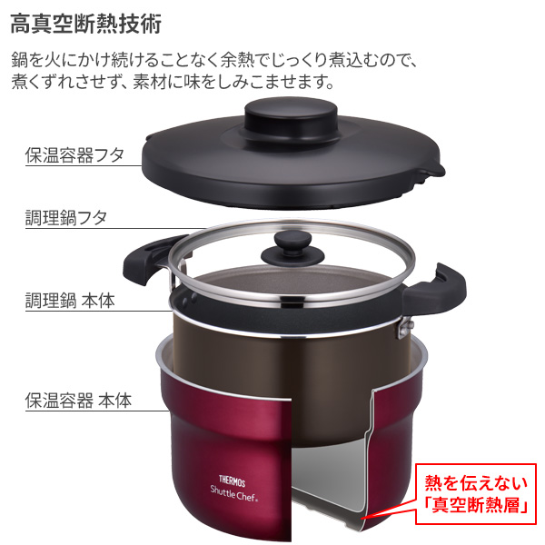 – 全新外鍋顏色 (酒紅色和炭灰色),內膽配備玻璃蓋和易潔塗層,烹調清洗非常方便!只需將內鍋食材加熱煮滾,再移到外鍋進行真空燜煮即可,全鍋導熱均勻快速不易燒焦