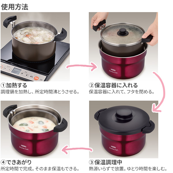 – 內鍋可用於明火或電磁爐(IH 200V對應),只要煮好食材後放入外鍋,即可進行保溫或慢慢高溫熱力燜煮食物,用來煲粥、煲湯、燜牛、燜豬一樣咁得。