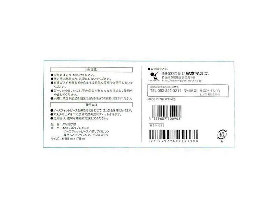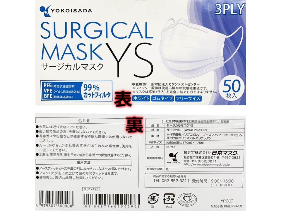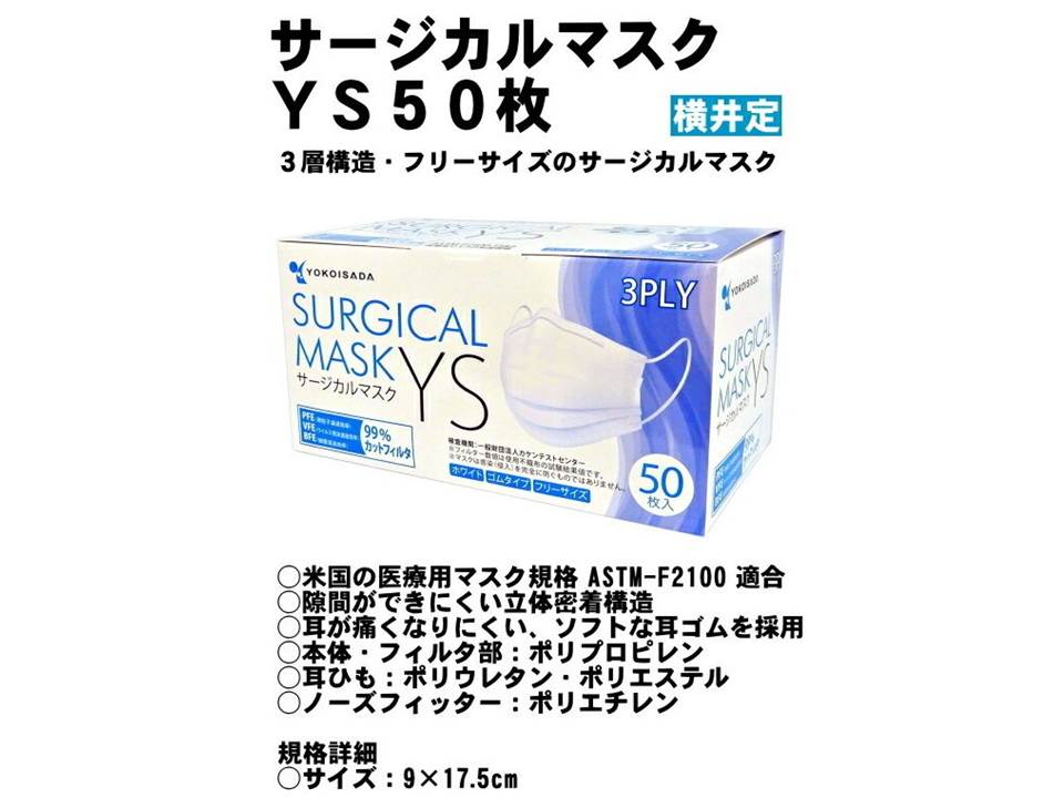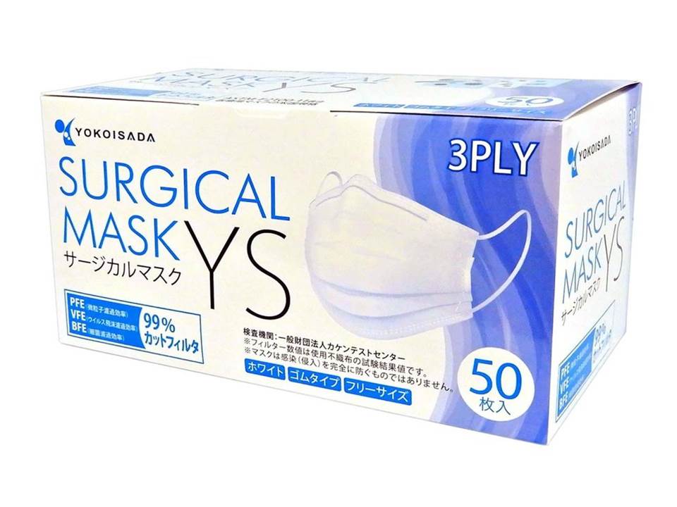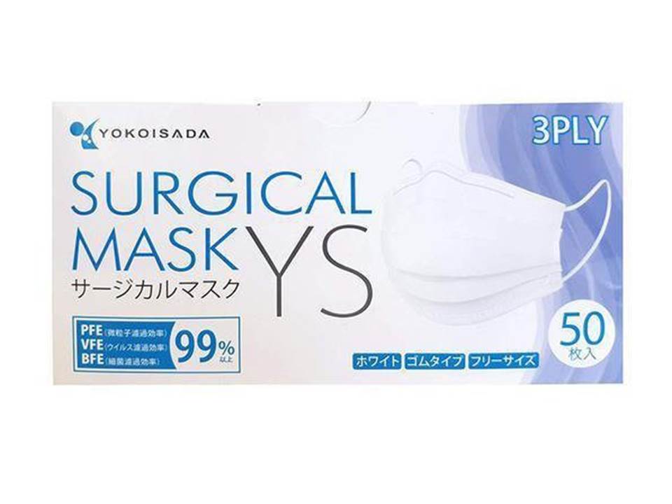 日本著名口罩生產商橫井定Yokoisada出產 (一般尺寸9cm x 17.5 cm) 每盒50個